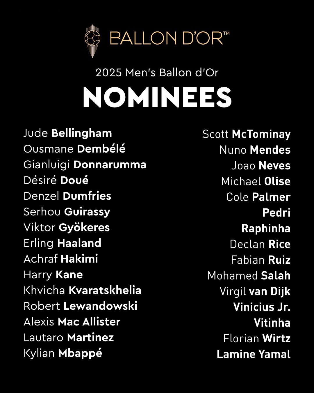 Vào ngày 7 tháng 8, ban giám khảo chính thức của Quả bóng vàng sẽ công bố danh sách các ứng cử viên cho giải Quả bóng vàng 2025 vào lúc 21:15 tối ngày 7 tháng 8. Trong số đó, hai ngôi sao đang lên được kỳ vọng là Yamal và Douai có tên trong danh sách, và 9 cầu thủ của Paris Saint-Germain bao gồm Dembélé đã được chọn. Danh sách ứng viên (không theo thứ tự cụ thể) Dembélé (Paris Saint-Germain), Bellingham (Real Madrid), Donnarumma (Paris Saint-Germain), Dumfries (Inter Milan), Douai (Paris Saint-Germain) Gilasi (Borussia Dortmund), Haaland (Manchester...
