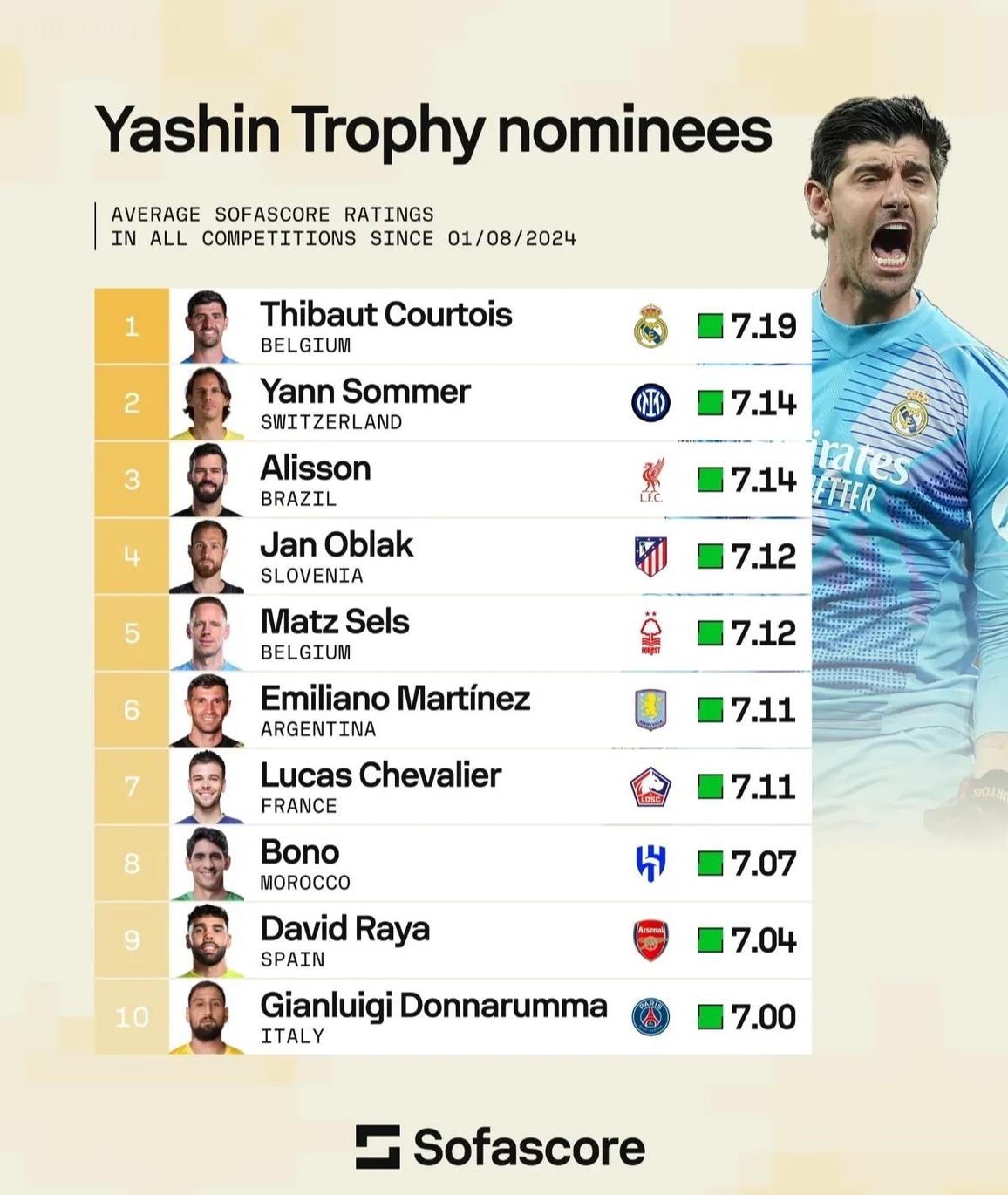 Vào ngày 8 tháng 8, hãng thống kê nổi tiếng Sofascore đã công bố điểm trung bình của 10 ứng cử viên cho giải thưởng Yashin (Thủ môn xuất sắc nhất) năm 2025. Giai đoạn thống kê bắt đầu từ ngày 1 tháng 8 năm 2024 và phạm vi thống kê bao gồm tất cả các giải đấu. Cầu thủ có thứ hạng cao nhất là thủ môn người Bỉ Thibaut Courtois của Real Madrid, với trung bình 7,19 điểm mỗi trận. Cụ thể, anh đạt trung bình 7,38 điểm trong 6 trận Club World Cup, 6,65 điểm trong 2...